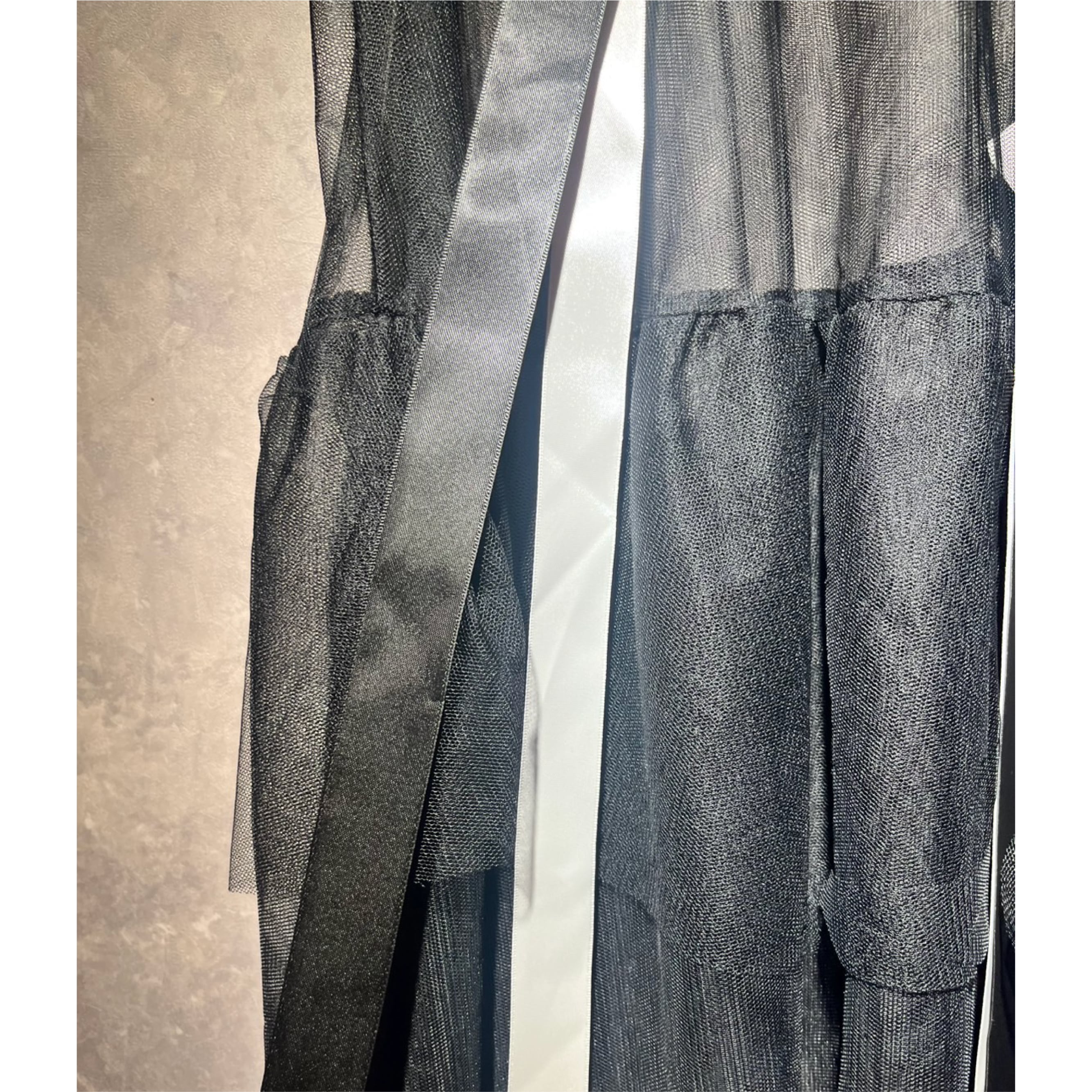 ウエストから白と黒のサテンリボンが垂れさがったデザインです